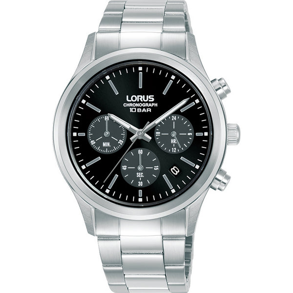 lorus quartz chronograph gents stainless steel black dial bracelet watch