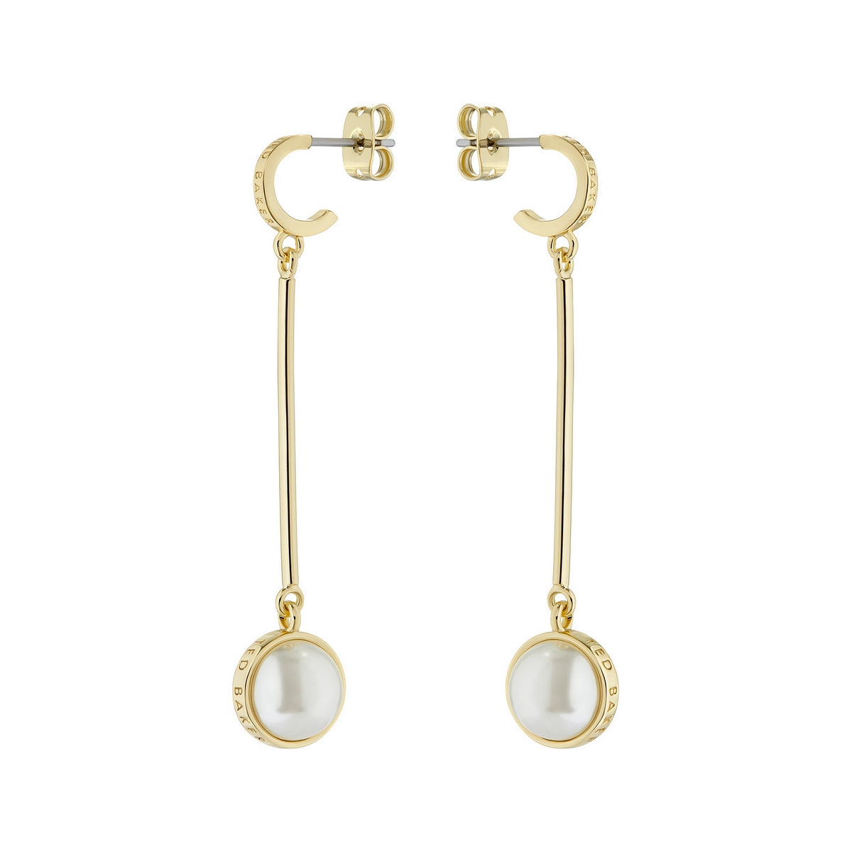 TED BAKER PERLLIE: Logo Pearl Gold Tone Long Drop Earrings