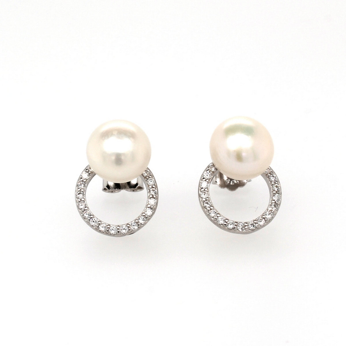Silver Pearl And CZ Circle Stud Earrings 8.5mm