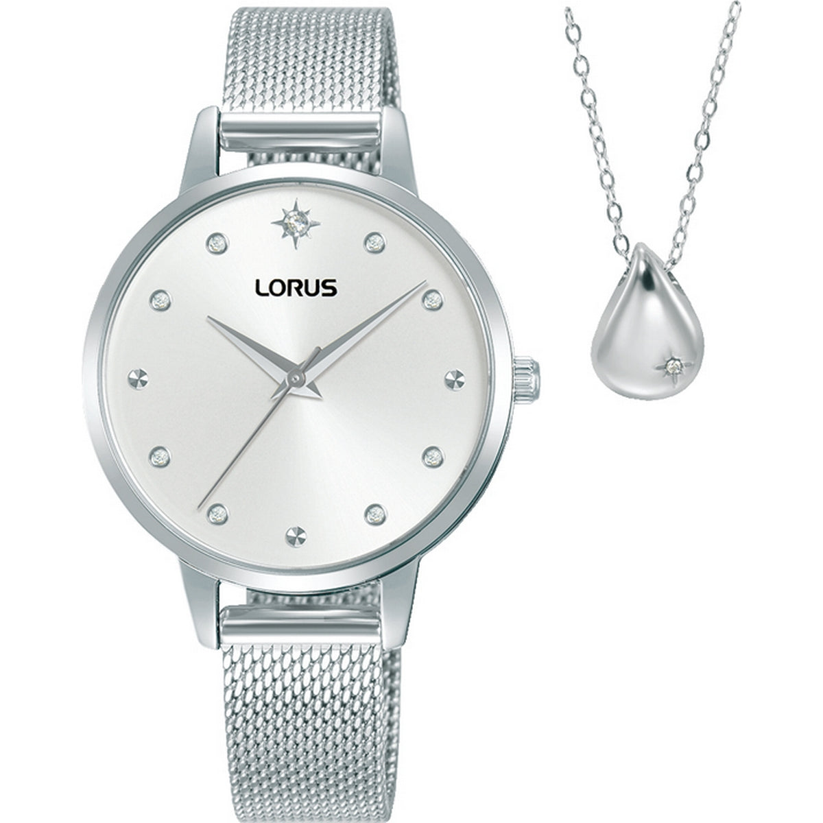 LORUS QUARTZ LADIES GIFT SET STAINLESS STEEL SILVER DIAL MESH BRACELET WATCH+PENDANT