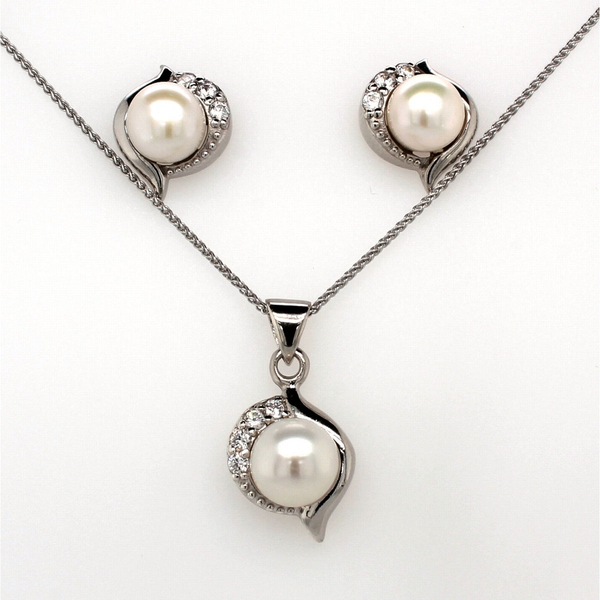 Silver Pearl And CZ Twist Stud Earring And Pendant Set 8mm